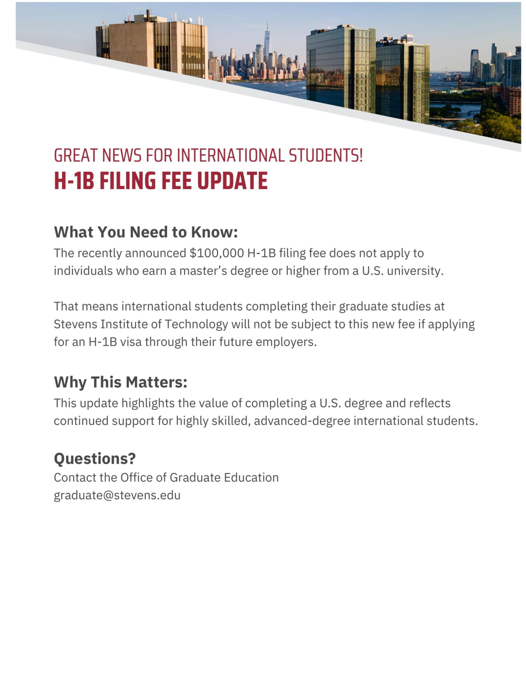 This means graduate students at Stevens Institute of Technology can apply for an H-1B visa without paying the new fee, making U.S. education even more valuable for international students.